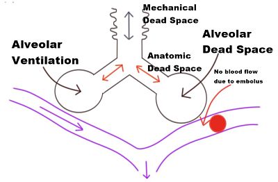 Dead space is the volume of inspired air that takes no part in gas exchange. Divided into 2 parts: ◗ anatomical dead space : mouth, nose, pharynx and large airways not lined with respiratory epithelium. ◗ alveolar dead space : unperfused alveoli . V entilated lung normally contributing to gas exchange, but not doing so because of impaired perfusion. Thus represents one extreme of V̇/Q̇ mismatch .